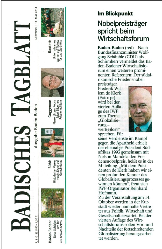 Nach Bundesfinzanzminister Wolfgang Schäuble (CDU) als Schirmherr vermeldet das Baden-Badener Wirtschaftsforum einen weiteren prominenten Referenten.